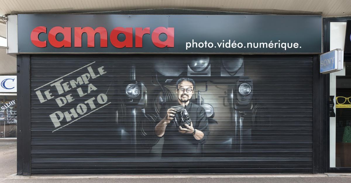 A notre connaissance, la première fresque sur rideaux métalliques de boutiques à Massy a été peinte en 2016 sur celui d’un magasin du Centre commercial de la Place de France consacré à la photo.