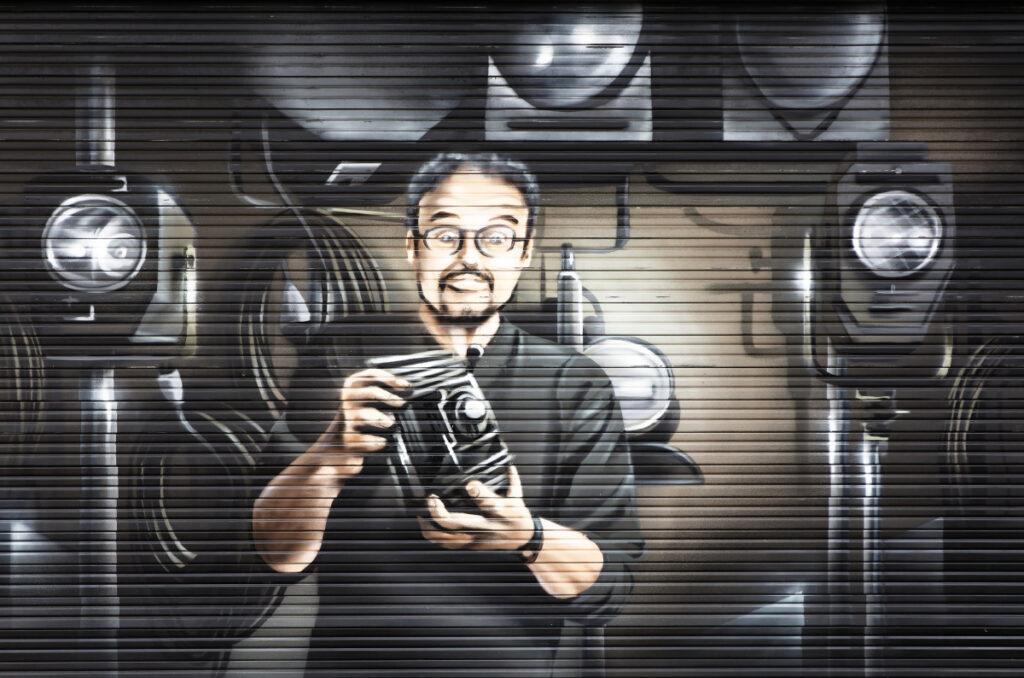 Les conditions de sa réalisation ne sont pas banales. Philippe raconte qu’un lundi de mai 2016 – c’est jour de fermeture – son fils lui annonce par téléphone une surprise pour le mardi. Il lui téléphone le mardi matin dès l’ouverture. Philippe, qui arrive à la boutique par le garage au sous-sol, n’a encore rien vu et découvre la fresque sur le rideau de la façade du magasin : au centre, son portrait de face en plan américain, sur fond de matériel professionnel ; il présente un appareil photo ; à gauche, en gros caractères, en diagonale sur trois lignes : Le Temple / de la / Photo. Les deux rideaux des vitrines latérales seront peints plus tard : un portrait de Philippe et son vendeur Jean-Loup, du matériel photo.