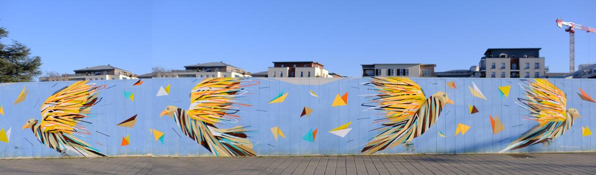 C’est ce que l’on retrouve sur la fresque de l’avenue Carnot qui représente, sur un fond bleu, quatre pigeons en vol au milieu de formes géométriques triangulaires de couleurs vives – blanc, rouge, jaune, noir… Les pigeons sont eux-mêmes très colorés, leurs ailes déployées sont d’un jaune vif strié de fils blancs, noirs et rouges. Leurs becs sont eux aussi jaune vif et leurs têtes gris clair. Le corps des pigeons se compose de stries moins flamboyantes que les ailes mais toujours de couleurs diverses, noires, bleues, blanches, brun clair. Leurs pattes sont noires. Les mêmes couleurs ont été utilisées pour le corps des pigeons et pour les motifs géométriques. Les oiseaux occupent le centre de la fresque et toute la hauteur de celle-ci et sont opposés deux par deux.