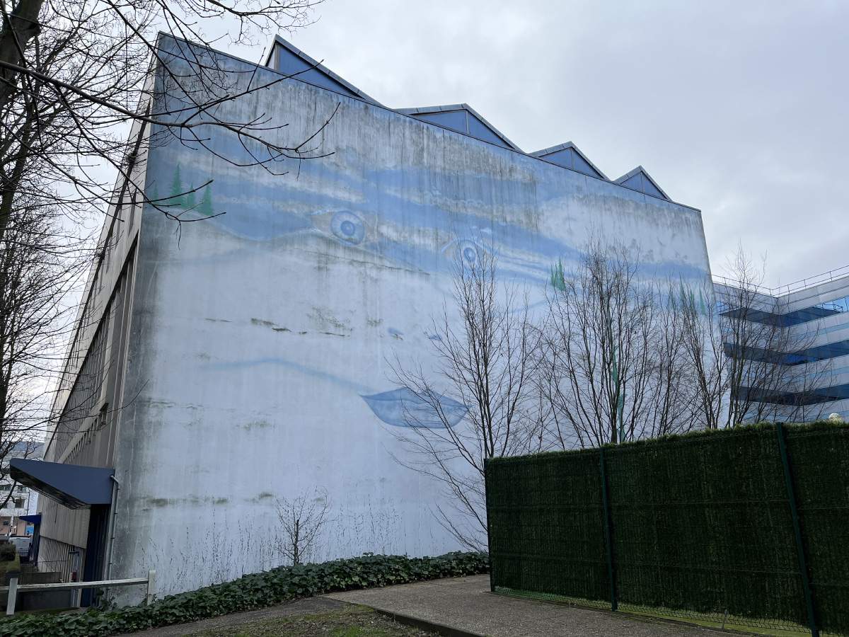 Dans le Grand Ensemble, une fresque bleue apparaît sur le pignon du Centre des finances publiques au 8 avenue de France.
