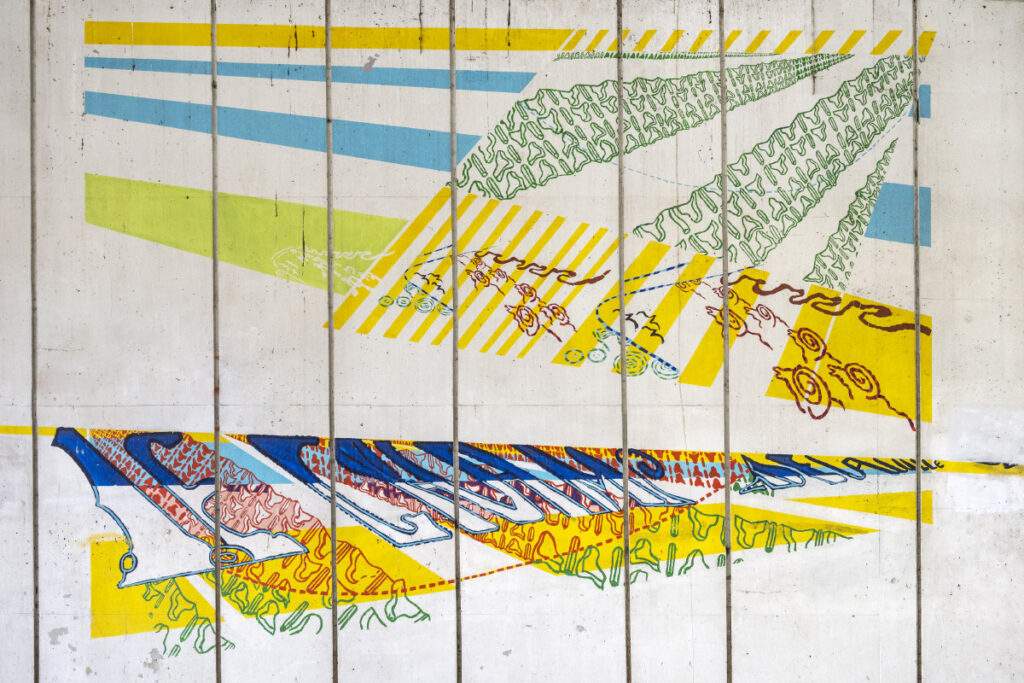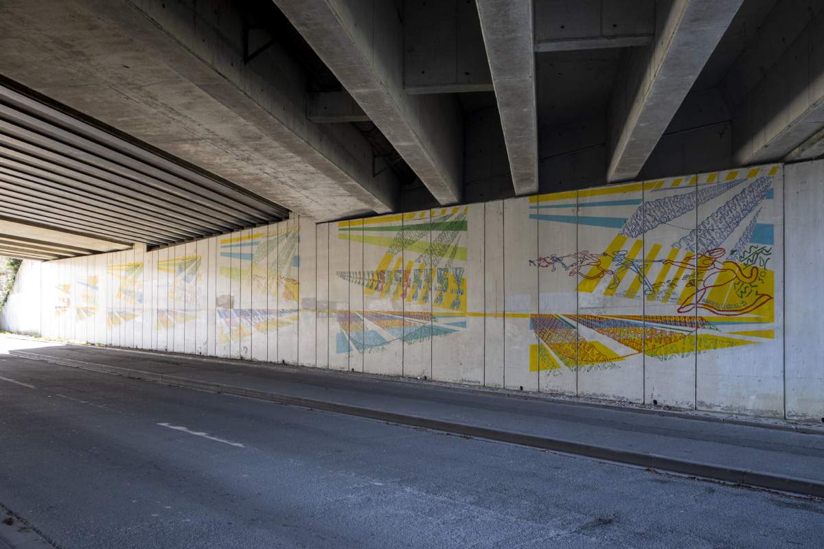 Sous le pont du TGV, rue d’Estienne d’Orves, l’un des deux murs bordant la route est tapissé d’une fresque de 225 m², constituée de sept tableaux qui sont des rectangles d’or, dont le rapport de la longueur à la largeur est le nombre d’or 1,618. Elle a en effet été réalisée selon la suite de Fibonacci, dans laquelle les deux premiers termes sont égaux à 1, et les termes suivants sont égaux à la somme des deux termes qui les précèdent (1, 1, 2, 3, 5, 8…). Les quotients de deux termes consécutifs de cette suite approchent le nombre d’or. « C’est cette suite qui instaure le rythme des éléments de la fresque par progression et régression dans les dimensions des sujets et dans les fréquences des couleurs. Le rythme est donné par le trait : montant-descendant-long-court-fort-faible et par la répétition. Chaque élément a les proportions du nombre d’or et comporte un rectangle d’or et deux carrés parfaits. »