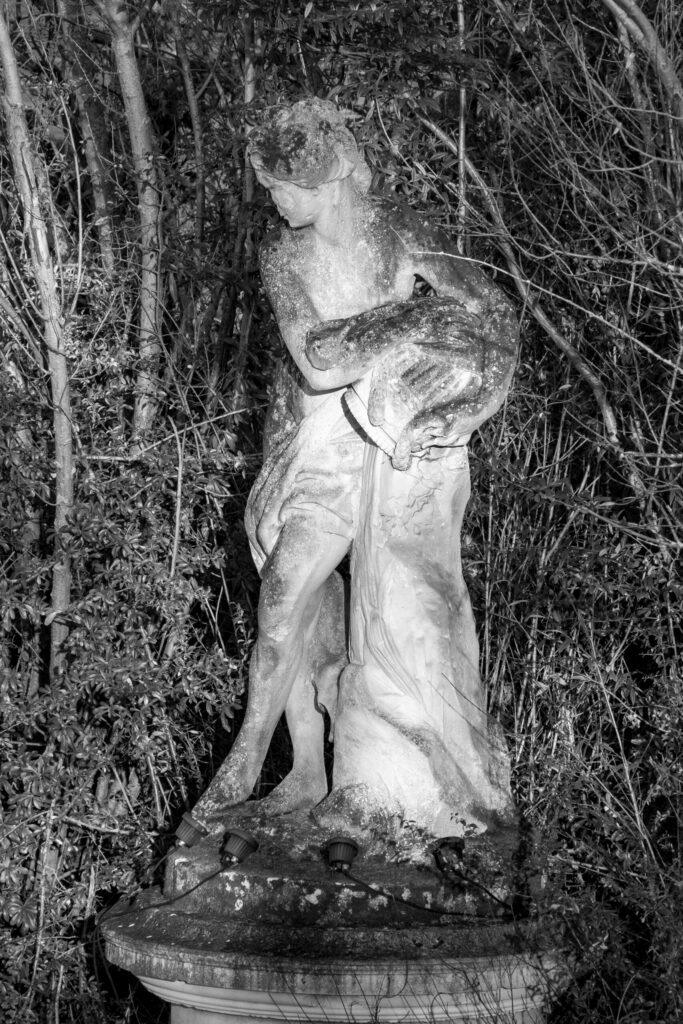 Cette femme de pierre, sans doute de marbre blanc, verse du grain dans un sac situé à ses pieds : elle représente Cérès, déesse latine des moissons, souvent identifiée à Déméter, déesse de la fertilité dans la mythologie grecque.
