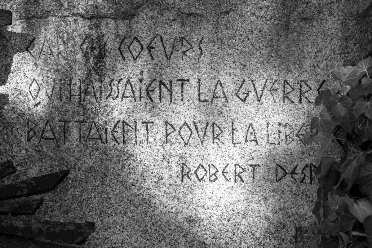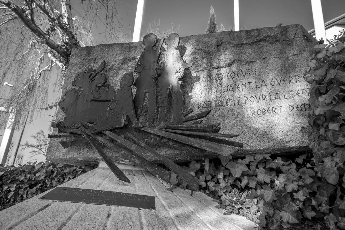 « 24 août 1944 Libération de Massy par la 2e DB » et un bloc de granit rose, fixé sur le socle, où l’on peut lire : « Car ces cœurs qui haïssaient la guerre battaient pour la liberté » , signé Robert Desnos. À côté, sur la partie gauche, une sculpture en métal noir représente un char et deux soldats debout et un assis.