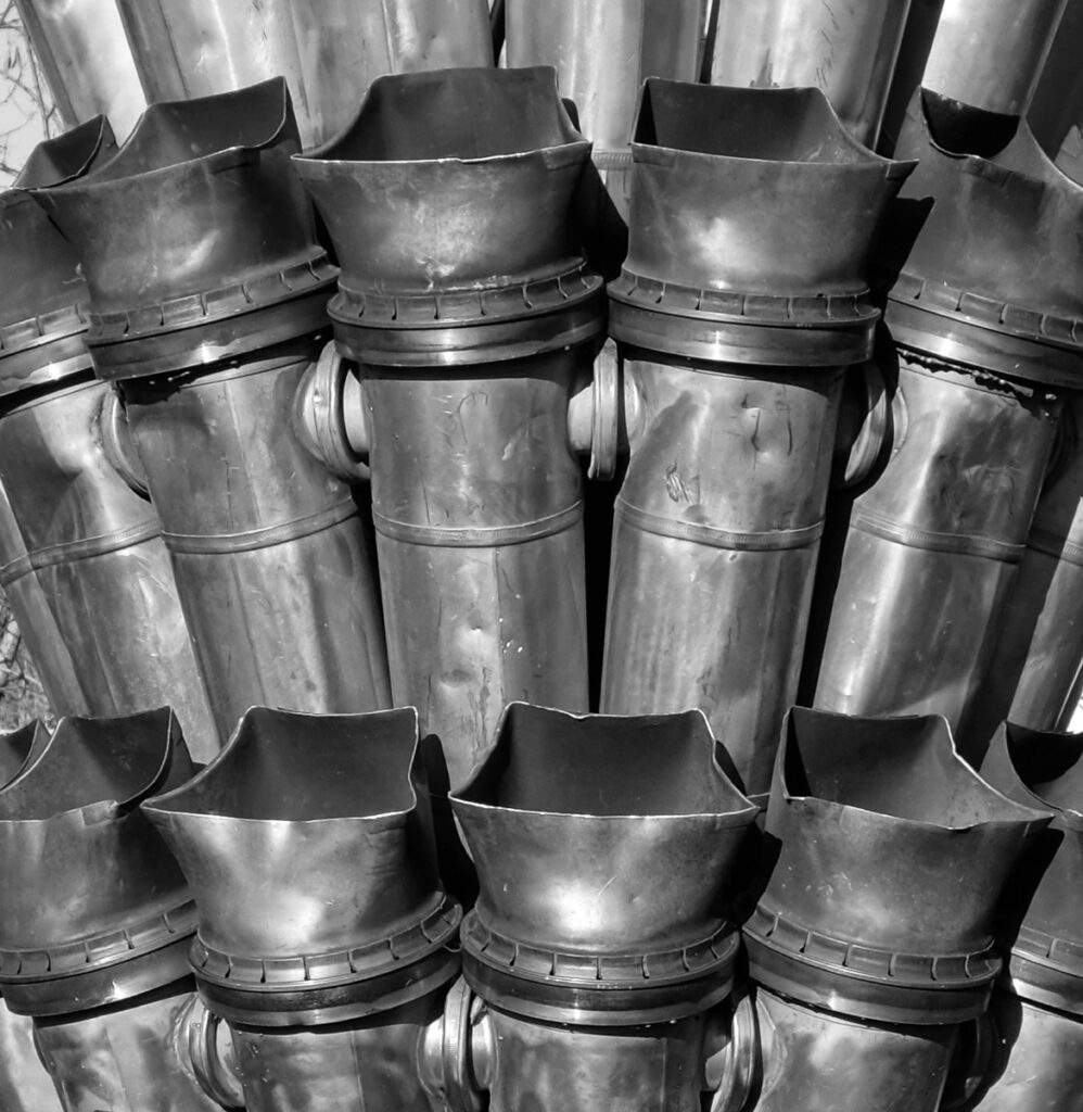 Cette tour de tuyaux est de la même inspiration que les deux structures dressées par Albert Féraud et Michel Guino : même taille, mêmes matériaux. Elle est sans doute plus ancienne puisque les cartes postales la montrent en signal à l’entrée du Hameau de Villaine après la construction des tours livrées en 1967-68.